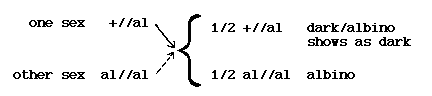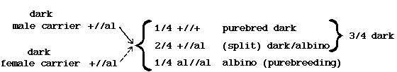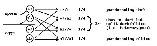 Doves that are carriers ("split" = heterozygotes) of albino may have some albino offspring. In fact, on the average, 1/4 of the offspring would be albino. If we use al to = the albino gene and + to = the alternative normal gene (allele) it can be diagramamed like the figures below. (For the gene symbol some persons may prefer just the "a" for the albino gene symbol, or c = colorless used in some other species. Also remember that an individual has 2 genes for any one character, but sperm or eggs have only one.)