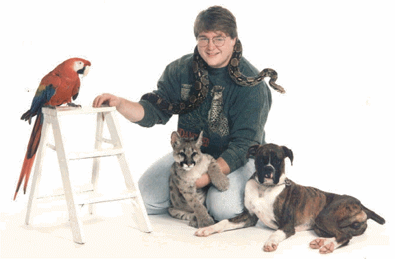 Kevin Stalder, a friend and former student in genetics class, is pictured here with some pets. Left to right, Scarlet Macaw (Ara macao), Cougar (Felis concolor), Boa Constrictor (Boa constrictor) and "Oliver" his brindle Boxer dog. Kevin has a vertiable zoo including peacocks, pheasants, chickens, pigeons, doves, mice, llamas, mutant color deer, plus.