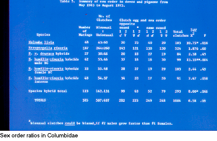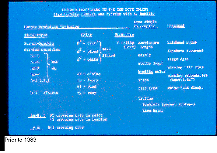 More Dove Pictures I, More Dove Pictures II, More Dove Pictures III, More Dove Pictures IV, Ice Dove Colors, Hatchling variants, Hybrids, Mutant Colors in other species, Oddities: Silky Doves, Flare, Bulge eyes, Bald Squabs, Dwarf Turtle Dove, Sex Ratios, Genetic Characters.