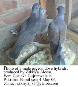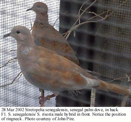 Species hybrids should be produced only for experimental purposes. Since this is not only a species cross, but also a generic cross [Columba livia/Streptopelia risoria], these hybrids are sterile like mules. But the males, at least, are vigorous and will mate and raise fostered eggs and hatchlings.